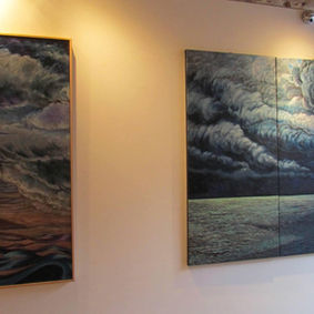 Rosalba Carlino presenta un suggestivo tema celeste fatto di cieli macchiati di nuvole bianche, la ripetizione con sfumature diverse è sempre densa di plasticità e profondità, tanto da far pensare ad una grande finestra che rimira uno spazio, rassicurando una posizione privilegiata ad un ipotetico osservatore, attratto dalla meraviglia dello spettacolo delle nuvole che si rincorrono assumendo forme bizzarre, effimere nella loro esistenza; il tempo di un alitare di vento dell’attraversamento dell’occultamento di un raggio di sole.